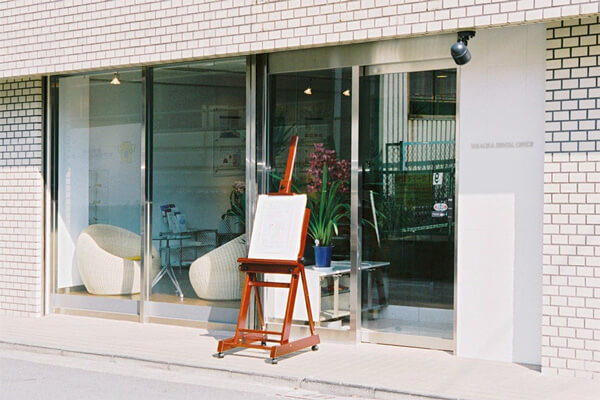 スタンド看板が医院正面にあります。当院正面はガラスになっており、入り口は向かって右側の自動ドアです。