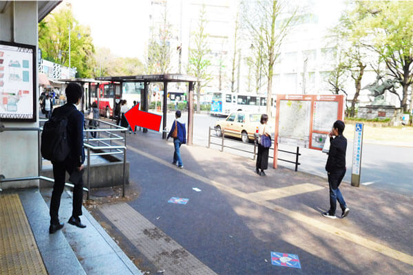 バス停があります。 ロータリーに沿って左側に歩道を歩いてください。