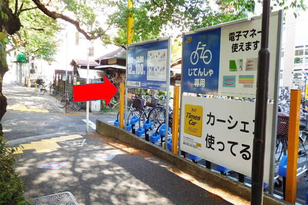 進行方向右手にタイムズ駐輪場(自転車)があります。その駐輪場の角を右折してください。