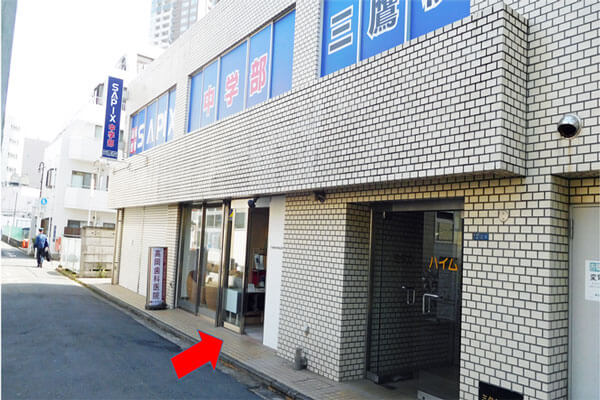 駐輪場の角から10m先の、進行方向右側、駐輪場の隣のビルの1階が当院です。