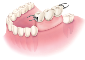 画像は歯を失った部分に取り外しができる入れ歯を入れている状態の模式図です。